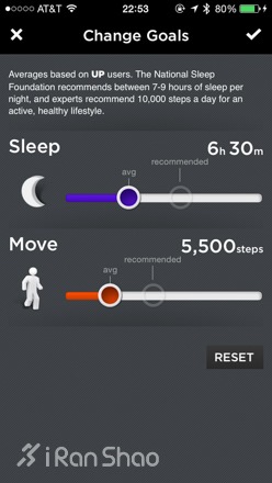 追踪、搜集、记录完这些数据之后,UP应用还提供分享、比较、目标设定之类的功能鼓励用户多运动,睡好觉。譬如应用会告诉你,所有用户一天平均运动的步数是9000,而你今天才走完3000步,或者朋友、队友已经走完10000步,用这种方式来激励用户达到目标。