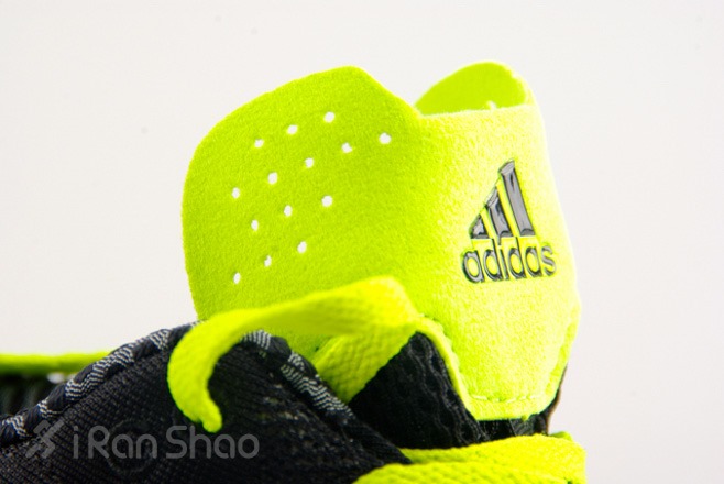 后跟部位为了散热做的比常规跑鞋薄约1/3,通过一块PU对脚跟进行加固和支撑。