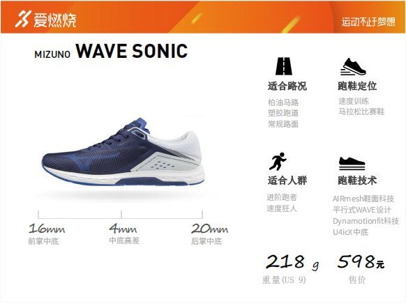 Mizuno Wave Sonic是美津浓第一双4mm落差的跑鞋,定位竞速鞋,相比于其他同类鞋款,Wave Sonic的保护性和耐磨性都非常出色,缺点可能就是重量偏重一些。所以这款鞋更适合那些寻求进阶的跑者,既保证了速度,同时兼具保护和缓冲。