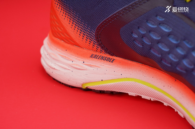 Kalensole泡沫鞋底与传统的泡沫鞋底相比,减震缓冲效果提升了34%, 能量响应增加了25%;鞋跟处的K-Ring环型设计,能够很好的分散跑步时的冲击波,有效保护身体(关节、背部、膝盖等)。