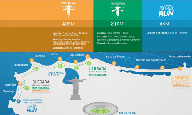 各个项目的出发时间都有所不同。全程女子发枪在早晨7点,有男子精英和其他参赛者在7点半起跑,半程比赛的各个小项则从6:30开始。比赛起点设在里约西区美丽的班德兰蒂斯体育场,终点设在 Flamengo公园。