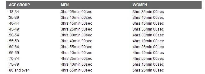 各种年龄组的 BQ 如下图 ,第一栏为年龄,第二栏对应男子选手的达标成绩,第三栏对应女子选手的达标成绩。