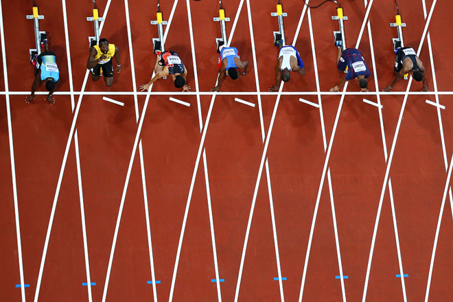 2017年伦敦世锦赛百米起跑前博尔特仰望天空 Patrick Smith摄