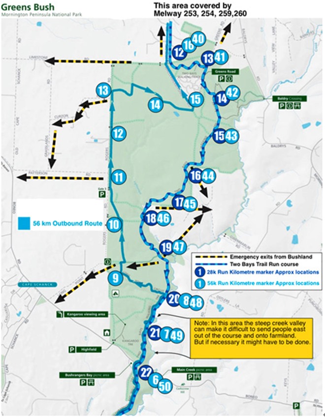 赛事共设28k和56k两个比赛距离,28k从小镇德玛纳(Dromana)出发,爬上半岛最高点亚瑟王座(Arthurs Seat),再沿着两湾小径(Two bays trail walk)一路跑到半岛的最南段灯塔夏轮克(Cape Schanck)。56k则要先从夏轮克跑到德玛纳再跑回来。两个起点不一样但同时起跑,中间有8公里弯道把两边的精英选手错开,以方便他们冲击赛会纪录。折返的赛道设计可以让每个选手都跟尽可能多的人碰面,当然这也是互道加油的好机会。
