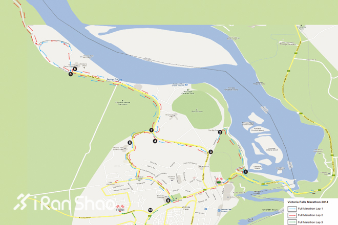 全程马拉松比赛在早晨6点45分从银行及邮局前的停车场地开始,一路向东2.5公里进入折返,然后一直向西完成15公里进入折返。在比赛的17公里处到达著名的维多利亚瀑布。折返后会经过5公里多的赞比亚国家自然保护区,最后抵达终点维多利亚瀑布小学。