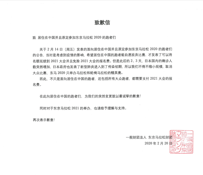 受新冠病毒肺炎疫情的影响,东京马拉松官方正式宣布取消38000人的大众组赛事,仅保留200人精英组(包括轮椅精英组)的比赛。
