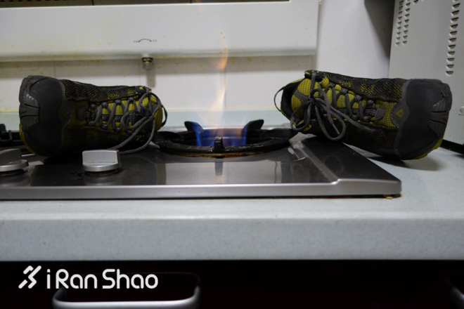 我烤!放在火上面烘烤乃是大忌,这种处理会加速鞋面材料的老化,尤其GORE-TEX的材料,遇火高温便会融化,失去应有的效能。而且可能造成脱胶变形等不良后果,所以这种事情不要干为好。