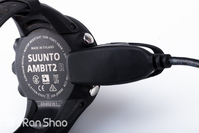 背夹设计的数据/充电线负责AMBIT2 R的充电与数据同步。背夹的接口接触面较小,而且没有固定的卡扣设计,所以在连接时需要留意,背夹是否夹好,避免没有固定好造成充电连接不完整的情况。