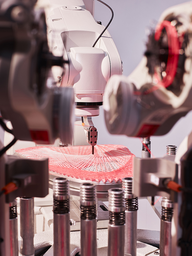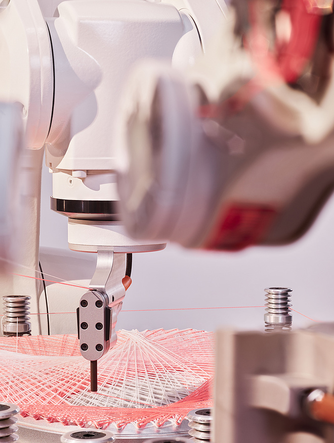 整个STRUNG鞋面制作的机械设备,也是由团队独立搭建完成。目前制作一个鞋面的时间大约需要25分钟,团队已经在美国、德国、中国部署了大量机器和设备,探索设计方向、制作样品、完成工程任务或验证织物特性。团队希望通过努力,在几个月之内将单只的生产时间降为8分钟。