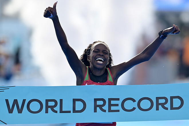 10月17日,2020年半马世锦赛,来自肯尼亚的佩雷斯·杰普彻彻以65分16秒的成绩率先冲线,再一次打破纯女子半马世界纪录,实现一年内两刷世界纪录的壮举。