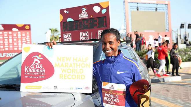 2月21日,在阿联酋哈伊马角酋长国的Al Marjan岛举行的RAK半马比赛中,布里吉特·科斯盖和阿巴贝尔·耶沙内疾速对飙,两人双双打破原女子半马世界纪录,其中,阿巴贝尔·耶沙内棋高一招,64分31秒夺得冠军,布里吉特·科斯盖第二。