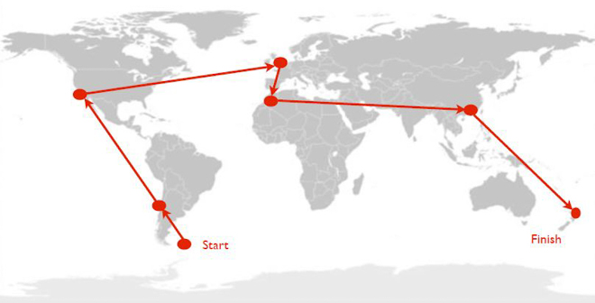 从2013年2月16日福克兰群岛上开始,到圣地亚哥 – 洛杉矶 – 伦敦 – 卡萨布兰卡 – 香港 – 奥克兰。新西兰人Mike Allsop在每个洲际上完成标准马拉松的距离,这个距离将被记录于GarminGPS手表中,并用GPS卫星追踪证实。所有一切,源于慈善。