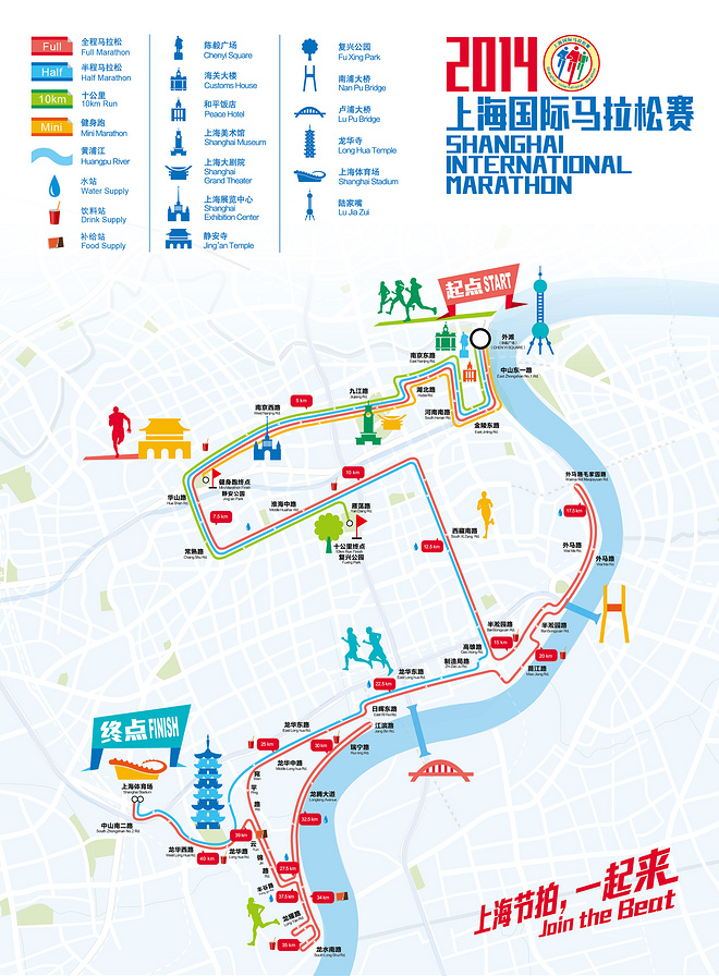 2014年上海马拉松的线路将继续沿用2013年的线路安排,比赛项目:马拉松(42.195km)半程马拉松(21.0975)10km跑 健身跑