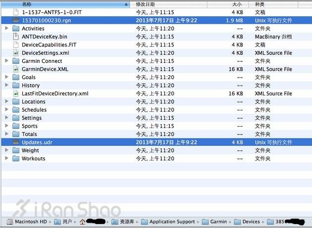 4. 解压后的两个文件(Update.udrs和153701000230.rgn)复制到”/Users/用户名/Library/Application Support/Garmin/Devices/手表序列号名”,如图所示